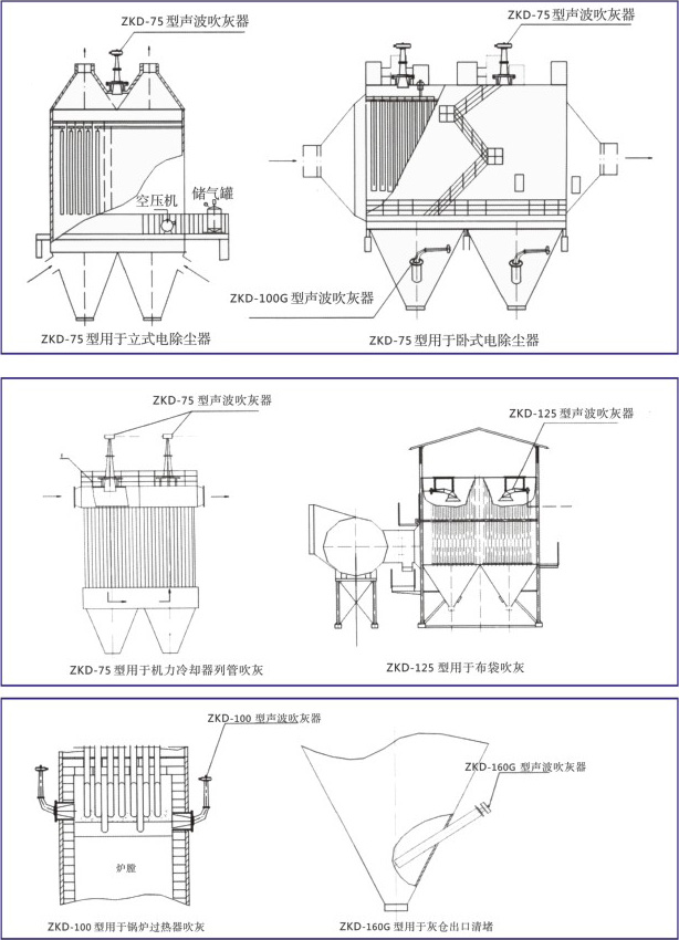 聲波吹灰器由發(fā)聲器,擴(kuò)聲筒,氣路控制系統(tǒng)及電控單元組成,適用于鍋爐受熱面,SCR系統(tǒng),ESP除塵器等部位的清灰。而且,聲波吹灰器也用于布袋除塵器,旋風(fēng)除塵器,料倉,管道等易形成粉塵堆積,粘掛,流通不暢的場合。